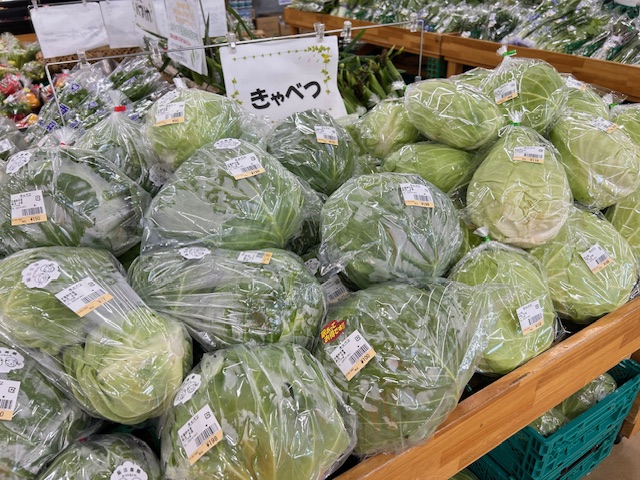地元産のキャベツが入荷しています。大きな玉ですが、とってもお得な値段で販売しています。サラダや炒め物やロールキャベツなど様々に使える万能野菜のキャベツ。寒くなってきたので暖かい鍋に使って体の芯から温めたいですね。