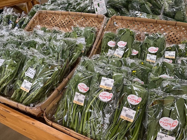 アスパラ菜やほうれん草など葉物野菜が入荷しています。アスパラ菜はアスパラとは違いますがアスパラに似た風味と食感をもっています。クセが少ない野菜なのでおひたしや炒め物などにも向いています。なかなか出会うチャンスが少ない野菜かと思いますのでぜひ試してみてください。