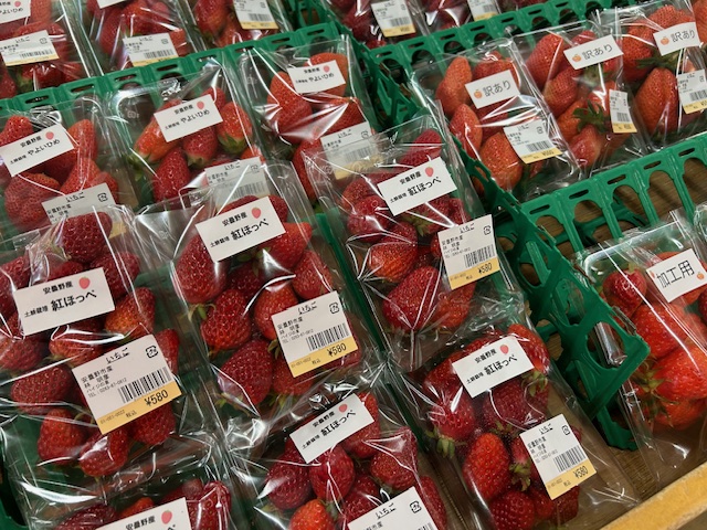 地元産のいちごが入荷してきました!!売り場はいちごの甘い香りに包まれていてこれぞ春の香りだな~と感じます。ヘタのところまで赤くなったいちごが入荷するのは直売所ならではだと思います。甘くておいしい春の味覚のいちごを堪能してください。