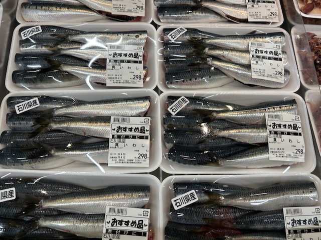 毎週金曜日恒例鮮魚の日です。本日のおすすめ品は石川県産「真いわし」です。煮つけやフライや塩焼きがおすすめ。1パック298円でとってもお得です。夕ご飯のおかずにいかがでしょうか。マグロやタイの冊も販売していますので、入学・進学の祝の御馳走やちらし寿司の具材としてもおすすめです。
