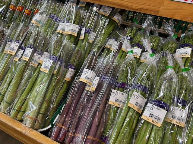 今が旬のアスパラガスが入荷しています。ホワイトアスパラガスや紫のアスパラガスも入荷しています。紫アスパラガス…実はグリーンアスパラガスよりも甘みが強いんです、希少なうえに甘みが強いなんてぜひともゲットしたいですね。茹でるとグリーンになってしまいますが、色の変化をお子様と楽しむのもいいですね。